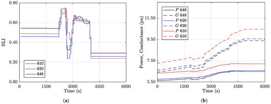 Stable scenario response of (a) NLI response and (b) active power transfer & apparent conductance at EHV buses 610 (Acharnon), 620 (Koumoundourou) and 648 (Ag. Stefanos).