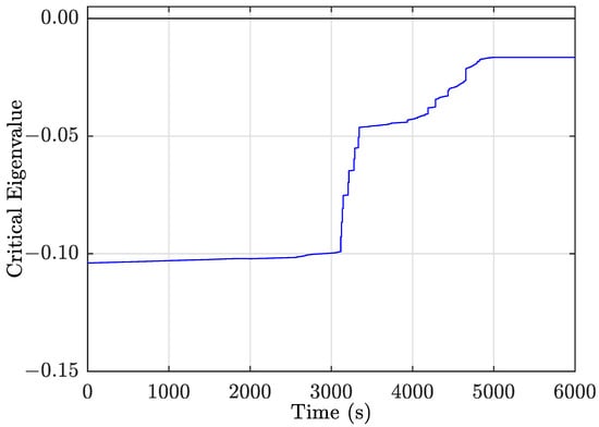 The fact that the system response is marginally stable is verified by the critical eigenvalue of the Jacobian of the long-term equilibrium equations (Figure 12), which continues to remain negative, although very close to zero, indicating that an additional system degradation will lead to instability. Taking into account that the system manages to remain marginally stable, there is no need to shed load, although corrective but non-intrusive actions by the operators are obviously required in order to enhance transmission system voltages, as they remain slightly above pu.