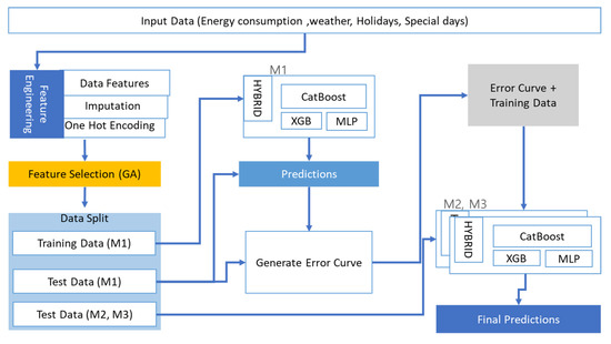 Several factors affect machine learning-based forecast accuracy of energy consumption, including changes in weather, holidays, and weekends. Mosavi et al. [31] have reviewed the machine learning-based energy consumption prediction methods. They have reported a remarkable rise in the efficiency and an expanding performance of the forecast technologies utilizing the innovative hybrid and ensemble prediction paradigms. This article also proposes a hybrid model and error curve training and to analyze energy predictions. We used hybrid ML models with CatBoost, Xgboost, and multi-layer perceptron. We named three hybrid models, M1, M2, and M3, respectively. M1 is used to obtain the error curve, M2 is used to predict the error curve, and M3 is used for the final prediction. We have used a genetic algorithm for the optimal feature selection and utilized the hybrid model (M1) error as a feature to improve forecast accuracy. The average error is 2.78% on weekdays, 2.79% on weekdays, and 4.28% on special days. We considered significant prediction errors and subsequent errors. We also analyzed factors such as temperature changes and energy use during hurricanes. Finally, other factors, such as holidays and weekends, are also taken into account to explore critical errors. Researchers have used various machine learning algorithms to forecast energy consumption [32,33,34]. Singh et al. [35] have proposed a model to improve the prediction accuracy of building energy prediction. They have used a deep learning model with two hidden layers and three hyperparameters. They enhanced the prediction accuracy by adding more features. Peng et al. [36] have used the machine learning method for the energy consumption prediction of ships. They collected and analyzed 15 characteristics affecting the ship’s power consumption by the Chinese port of Jingling. They used five machine learning models. The external features of the ship and the port were set as inputs. Later k-fold cross-validity was used to verify the validity of the models. Finally, the importance of the features is calculated, and the most important feature is selected. The study by Le et al. [37] proposed an electrical energy cost forecasting model that used a combination of the Convoluted Neural Network and the Bi- long-short term memory model to predict electrical energy consumption. The first module extracted important data from different variables in two CNN separate household power consumption datasets in this framework. The Bi-LSTM module with two Bi-LSTM levels then used the above information and two-way time series propensity to predict front and rear conditions. The values obtained from the Bi-LSTM module were sent to the final module, which consisted of two fully connected layers to predict future energy consumption. Cauwer et al. [38] proposed a solution to the energy costs predicted by electric vehicles. The energy consumption of electric vehicles was variable and depended on many external factors. They determined and measured the relationship between a vehicle’s kinetic parameters and its power consumption. Trejo et al. [39] analyzed energy consumption forecasts for greenhouses using a synthetic neural network with a multi-layer perceptron. They practiced temperature and humidity models as inputs for forecasters in addition to time and energy costs. Furthermore, they examined forecast performance using real-time data from a greenhouse in Mexico. The conclusions showed that the selected ANN model gave a good energy consumption estimate of 95% significantly. Wang et al. [40] analyzed the prediction of energy consumption by office equipment. Lepri et al. [41] proposed a model to predict energy consumption derived from cellular network data. The relationship between weather, holidays, and the consumption of energy garners tremendous interest [42]. In this article, we have analyzed the cause of error in the prediction. For example, if there is some unexpected special day, the machine learning model might not accurately predict that day. For example, one of the highest errors recorded on 16 January 2019, was due to the lunar new year.