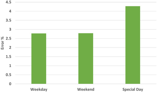 Figure 5 represents the mean error by weekday, weekend, and special day. Mean error on weekdays is recorded as 2.78%, for weekends 2.79%, and for special days it is recorded as 4.28%. From Figure 5, it is evident that special days cause a massive error in the prediction. There are different special days such as a new year, republic day, and Chuseok Day. There are two ways to obtain the Error curve: daily training of M1, and the other is one-time training. We have tried both methods and found out that daily training gives a better result. We have also tried different data ranges and got the best result from January 2013 to 2018.