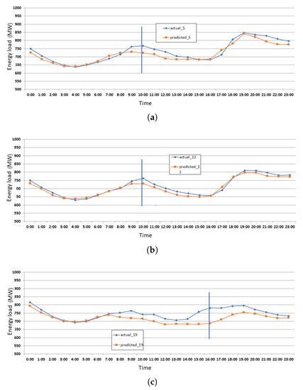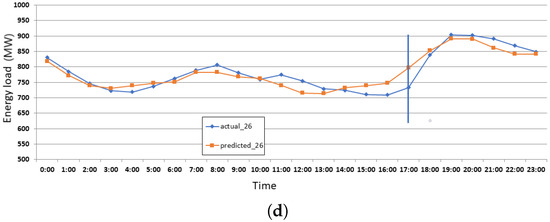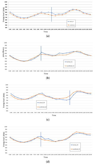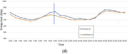 Figure 6 represents energy consumption on Saturdays in January 2019, which occurred on the 5th, 12th, 19th, and 26th of that month. The X-axis represents the time of day in hours and the Y-axis shows the energy consumption load. Figure 7 shows the details of the errors on each Saturday of January. Figure 7a shows the maximum error of Saturday, Jan 05. Figure 7b shows the maximum error of Saturday, Jan 12. Figure 7c shows the maximum error of Saturday, Jan 19. Figure 7d shows the maximum error of Saturday, Jan 26. The maximum error is recorded when a sudden increase in energy is recorded during the 10 a.m. to 02 p.m. of Saturday.