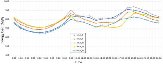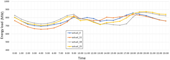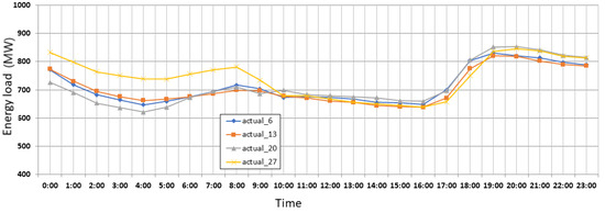 Figure 8 represents energy consumption on Sundays in Jan 2019, which occurred on the 6th, 13th, 20th, and 27th of that month.The X-axis represents the time of day in hours and the Y-axis shows the energy consumption load.