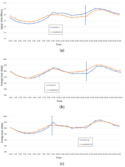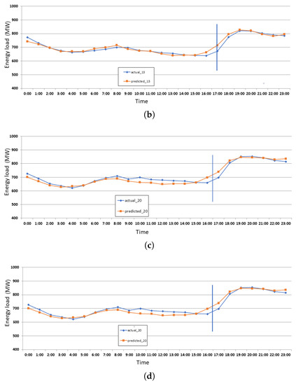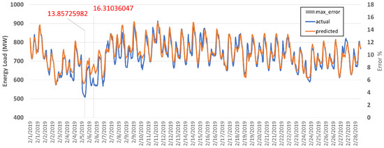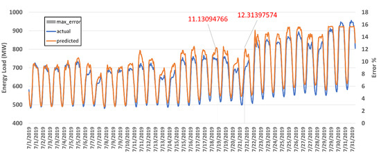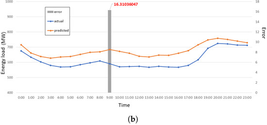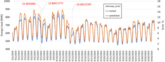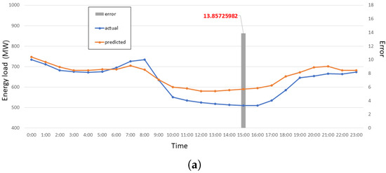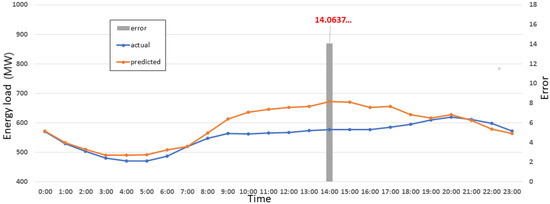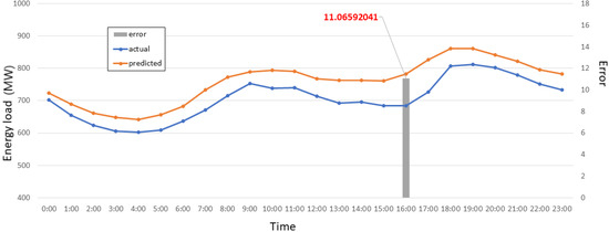 We compared the actual and predicted energy load consumption graph with a high error of 14%. We found that that day was a special day called Chuseok Day in South Korea. Figure 16 shows the chart of Sept 13 where the x-axis represents the hourly time, the y-axis represents the energy load, and the right y-axis represents the error. The maximum error recorded on that day was 14.06% at 14:00.