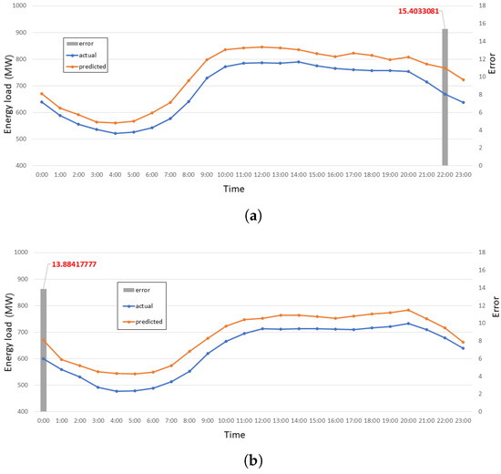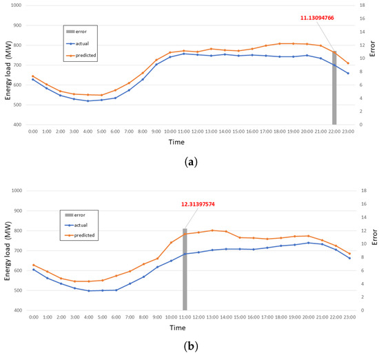 Figure 15 shows the highest errors recorded due to the lunar new year. Figure 15a represents energy consumption and error peak at the first holiday of the lunar new year. On this day, the highest error recorded was 13.85%. Figure 15b represents energy consumption and error peak at the second holiday of the lunar new year. On this day, the highest error recorded was 16.31%.