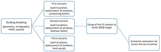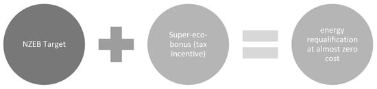 The aim of the paper is to demonstrate how different energy retrofit strategies on existing buildings can lead to the achievement of the NZEB target if encouraged by tax incentives, at zero or almost zero cost (Figure 3). This represents the innovative contribute of the paper in the current scientific-technical context.