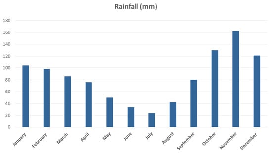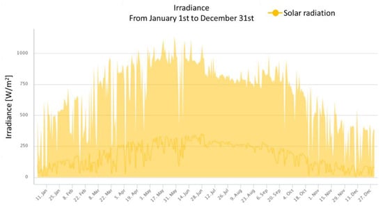 The case study refers to a single-family building located in Portici (near Naples, Southern Italy). The building is a typical civil building present in the outskirts of Italian metropolitan cities, as well as a very widespread type of building in Europe and for which this type of incentive is particularly suitable. The city of Portici, according to the classification reported by DPR 412/93 [], belongs to climatic zone C, with a value of Heating Degree Days (HDD) equal to 1028. Figure 5 and Figure 6 show some information about annual solar radiation and precipitation for the city of Portici.