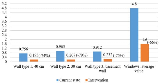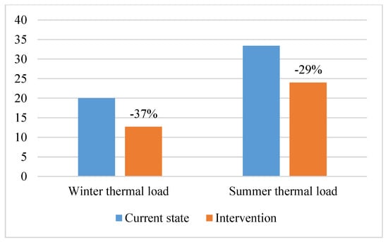 The absence of insulation system in the existing building has a significant impact on the thermal performance of the building. For this reason, the insertion of an insulation layer on the external walls and the replacement of the existing windows lead to a considerable reduction (60–79%) of the stationary thermal transmittance of the building components (Figure 8). Therefore, the building thermal loads are also reduced (−37% in winter and −29% in summer), as shown in Figure 9.