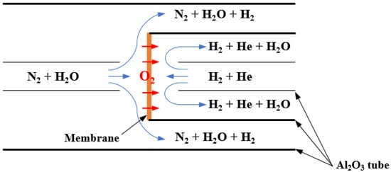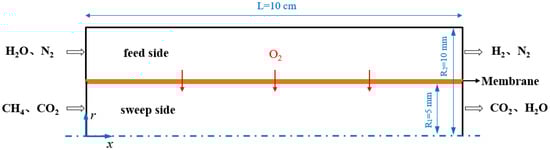 Figure 1 shows the schematic diagram of the 2D axisymmetric representation of the water splitting membrane reactor coupled with methane combustion, with x representing the axial direction and r representing the radial direction. The geometry consists of two concentric horizontal tubes with the outer tube made of quartz and the inner tube made of the LSCuF−7328 oxygen transport membrane. The reactor is divided into two zones by the membrane: a feed side and a sweep side. High-temperature water vapor in the mixture with N2 is fed into the feed side, while CH4 in mixture with CO2 as the sweep gas is introduced into the sweep side (i.e., the sweep gas is a mixture of CH4 and CO2). Both N2 and CO2 are used as the carrier gases. At an elevated temperature, oxygen and hydrogen are produced by a water splitting reaction on the feed side. Driven by the oxygen partial pressure differences across the membrane, oxygen permeates through the membrane from the feed side to the sweep side and then reacts with CH4. The permeated oxygen is consumed rapidly, the equilibrium of the water splitting reaction continues to move in the direction of generating hydrogen and oxygen, and then hydrogen is generated continuously.