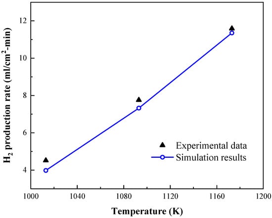 Due to the lack of experimental data fitted to the flow configuration described in the present work, a second model with the geometry used by Park et al. [8] was established to represent the experimental setup for the validation of the water splitting model. The simulation results of the second model were compared with the the experimental data by Park et al. The schematic diagram of the second model is given in Figure 3. As shown in this figure, a LSCuF−7328 membrane disk was affixed to one end of an Al2O3 tube, then they were placed inside a larger Al2O3 tube with one side of the membrane (defined as the feed side) exposed to the humidified nitrogen (N2/H2O = 0.51/0.49) and the other side (defined as the sweep side) exposed to a mixture of hydrogen and helium (H2/He = 0.8/0.2) [26]. The membrane thickness is 0.05 mm and the diameter of the membrane disk is 12 mm. The flow rate for both the feed and sweep gases was 150 mL/min [27]. The pressures of the inlet gas streams were 1 atm for the two sides. The numerical calculations were carried out with the reported experimental conditions, and a mixture of H2 and O2 was used to substitute the water vapor (N2/H2/O2 = 0.51/0.327/0.163) in the simulation. The comparison of the H2 production rate between the simulation results and experimental data is shown in Figure 4. It can be seen that the hydrogen production is enhanced as the temperature increases. This is because increasing the operating temperature can shift the equilibrium of the water splitting reaction to generate oxygen and hydrogen, and also lead to a reduction in the membrane resistance to oxygen permeation, thereby the amount of hydrogen generated increases. The simulation results are in good agreement with the experimental data. When the temperature is 1093 K, the maximum deviation between the simulation results of the hydrogen production rate and the experimental data is approximately 12%, which suggests that the simulation model is appropriate for the numerical investigation of the hydrogen generation process via water splitting in an oxygen transport membrane reactor.