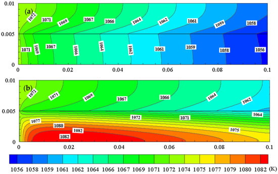 In this section, the results in terms of the temperature distribution and oxygen permeation rate under the non−reactive flow and reactive flow on the sweep side are compared. For the case of the non−reactive flow on the sweep side, CH4 is considered as an inert gas with no combustion reaction taking place on this side, the process only involves the water splitting and oxygen permeation. For the case of the reactive flow on the sweep side, all of the water splitting, oxygen permeation, and methane combustion occur in the membrane reactor. The two cases are under the same operating conditions taking the base case values of the boundary condition parameters described in Section 2.3.