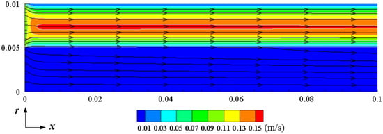 Figure 8 shows the distribution of the oxygen permeation rate for the two cases. It can be seen that when there is no combustion, the oxygen permeation rate along the length of the tube gradually decreases from 1.41 × 10−8 to 0.5 × 10−8 mol/cm2·s. The maximum permeation occurs at the inlet of the sweep side. This is because there is no oxygen in the sweep side inlet that provides the maximum oxygen partial pressure difference, the driving force for the permeation. As the oxygen gradually permeates into the sweep side, the difference in the oxygen partial pressure between the two sides gradually decreases; therefore, the oxygen permeation rate decreases along the tube length. When there is a methane combustion reaction, the oxygen permeation rate decreases gradually along the length of the tube. A maximum value of 2.99 × 10−8 mol/cm2·s is obtained at the inlet, and the value at the outlet is about 2.07 × 10−8 mol/cm2·s, which is significantly higher than in the case of no methane combustion. On the one hand, methane consumes part of the oxygen during the combustion process, which reduces the oxygen partial pressure on the sweep side, thereby increasing the oxygen partial pressure difference between the two sides. On the other hand, the heat released by the methane combustion increases the temperature of the reactor, thereby reducing the oxygen permeation resistance of the membrane; therefore, the oxygen permeation rate is higher compared to the rate without combustion. Clearly, hydrogen generation is directly related to the oxygen permeation rate. Hence, the improvement in the oxygen permeation rate will directly enhance the hydrogen generation. The averaged hydrogen production rate without the methane combustion is 1.86 × 10−8 mol/cm2·s, and it is 5.63 × 10−8 mol/cm2·s with combustion, which is a rate approximately three times higher than that of the former. Therefore, the coupling of methane combustion and water splitting reaction can significantly improve the hydrogen production capacity of the membrane reactor.