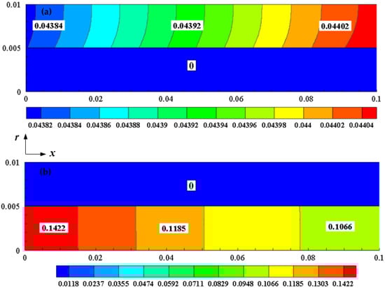 The temperature contours of the membrane reactor for the two cases are depicted in Figure 5. It is found that when there is no methane combustion reaction on the sweep side in the radial direction, the closer to the OTM, the lower the temperature is. Additionally, the closer to the OTM, the larger the radial temperature gradient is on the feed side. Along the axis, the temperature gradually decreases from the inlet to the outlet. This is because the sweep gas continually takes away the oxygen across the membrane generated by the water splitting. The oxygen on the feed side is then continuously consumed, the water splitting equilibrium continues to move toward the direction of generating oxygen and hydrogen. Water splitting is a highly endothermic process, and the reaction mainly occurs in the area on the feed side adjacent to the membrane; therefore, the closer to the OTM, the lower the temperature is and the larger the radial temperature gradient is on the feed side. Due to the continuous endothermic reaction, the temperature gradually decreases along the length of the tube. When there is a methane combustion on the sweep side, in the radial direction, the closer to the OTM, the lower the temperature is due to the endothermic effect of the water splitting. The closer to the rotation axis, the higher the temperature is. Due to the exothermic methane combustion process, the temperature on the sweep side in the axial direction gradually rises and peaks at approximately 1/5 of the tube length. Then, the temperature gradually decreases due to the continuous permeation of low-temperature oxygen.