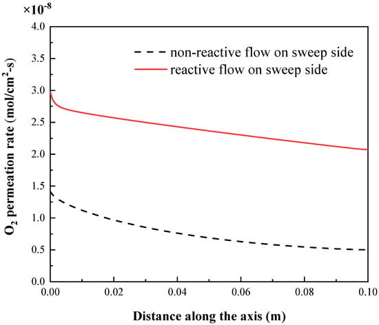 Distribution of O2 permeation rate under non−reactive and reactive flow on sweep side.