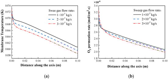 Effects of sweep gas flow rate on: (a) membrane temperature; (b) oxygen permeation rate.
