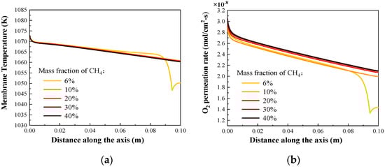 Figure 10 presents the distribution of the membrane temperature and oxygen permeation rate along the axis at different methane mass fractions. When the methane content is low, such as 6% by mass, the membrane temperature reaches a minimum near the outlet and then increases slightly. At a low methane content, the methane is completely consumed with oxygen somewhere near the outlet. Due to the endothermic effect of water splitting on the other side, the membrane temperature drops to the lowest. Then, driven by the oxygen partial pressure difference between the two sides, the oxygen continues to permeate into the sweep side. At this time, the oxygen partial pressure in the sweep side begins to increase, and the partial pressure difference gradually decreases, and thus the oxygen permeation rate will decrease accordingly. Hence, the water splitting reaction starts to slow down, and the temperature rises slightly thereafter. When the methane content is high, due to the excessive amount of the gas in the fuel, methane cannot be exhausted in the reactor, hence there is no minimum peak in the membrane temperature. With the continuing increase in the methane content, the membrane temperature changes slightly. At a high methane content, the oxygen permeation rate also increases slightly with the increase in the methane mass fraction.