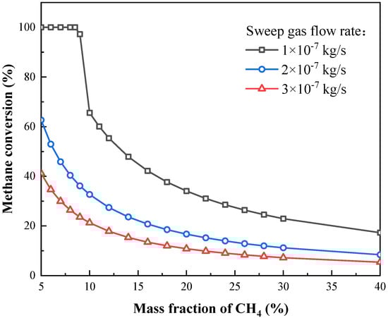 The change of methane conversion under different sweep gas flow rates and methane contents is presented in Figure 11. The methane conversion decreases with the increase in the sweep gas flow rate or methane content. At a sweep gas flow rate of 1 × 10−7 kg/s and methane mass fraction of less than 8.5%, the methane is completely consumed and the conversion is 100% due to the insufficient methane content. When the mass fraction exceeds 9%, the methane conversion begins to decrease due to the limited oxygen permeability of the membrane. When the mass fraction reaches 40%, the methane conversion decreases to 17.3%. When the sweep gas flow rate increases to 2 × 10−7 and 3 × 10−7 kg/s, and the methane content increases from 5% to 40%, the methane conversion decreases from 62.4% to 8.4% and from 41.2% to 5.4%, respectively. Since the methane conversion depends on the temperature and the amount of oxygen available for combustion, according to the above analysis, the membrane temperature decreases and the average oxygen permeation rate only has a slight increase. Hence, the methane conversion also decreases accordingly with the increase in the sweep gas flow rate. As the methane content increases, the oxygen permeation rate increases slightly, yet the increased amount of oxygen is not enough to consume the increased methane; therefore, the methane conversion also decreases.