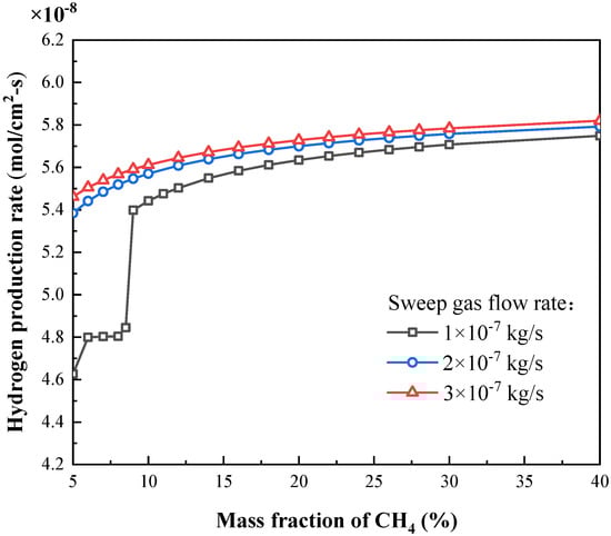 Figure 12 shows the changes in the hydrogen production rate of the membrane reactor under different sweep gas flow rates and methane contents. It is found that the hydrogen production rate increases with the increase in the fuel flow rate and methane content. At a sweep gas flow rate of 1 × 10−7 kg/s and a methane mass fraction of less than 8.5%, the hydrogen production rate has a slight increase with the increase in methane content. When the methane content increases from 5% to 8.5%, the hydrogen production rate only increases from 4.63 × 10−8 to 4.80 × 10−8 mol/cm2·s. In this case, the amount of methane is insufficient, and the membrane temperature and oxygen permeation rate both show a low value, and thus the hydrogen production rate will be a very low value. As the mass fraction of methane increases from 8.5% to 9%, the hydrogen yield increases rapidly from 4.80 × 10−8 to 5.40 × 10−8 mol/cm2·s. As the methane content reaches 9%, it can be seen from Figure 11 that the methane content is similarly excessive; there is combustion reaction on the sweep side in the entire tube. Both the membrane temperature and oxygen permeation rate increase, hence the hydrogen production rate increases rapidly. After that, when the methane content increases to 40%, the hydrogen production rate only increases from 5.40 × 10−8 to 5.75 × 10−8 mol/cm2·s. That is to say, when the methane is excessive, the hydrogen production rate increases slowly with the increase in methane content. This is because the membrane temperature is almost unchanged at this time, and the oxygen permeation rate also increases slightly; therefore, the hydrogen production rate has a slight increase. When the methane is excessive, the hydrogen production rate also increases slightly with the increase in the sweep gas flow rate. When the flow rate increases from 1 × 10−7 kg/s to 2 × 10−7 and 3 × 10−7 kg/s and the methane content is 40%, the hydrogen production rate only increases from 5.75 × 10−8 to 5.79 × 10−8 and 5.82 × 10−8 mol/cm2·s, respectively. This is because at these flow rates, methane is excessive even when the mass fraction is 5%. Therefore, in order to ensure the hydrogen yield of the membrane reactor, the methane needs to be excessive. Additionally, due to the limited oxygen permeation capacity of the membrane reactor, when the methane is excessive, with continuous increase in the methane content or sweep gas flow rate, the hydrogen production rate only has a slight increase.