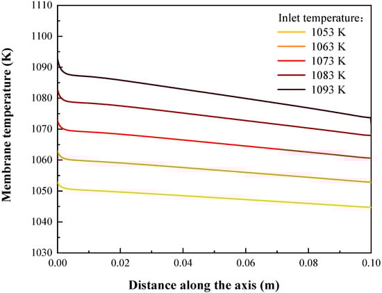 In this section, the effects of the inlet gas temperature on the membrane temperature, the oxygen permeation rate, the hydrogen production rate, and the methane conversion are investigated. The inlet temperature of the sweep gas is the same as that of the feed gas.
