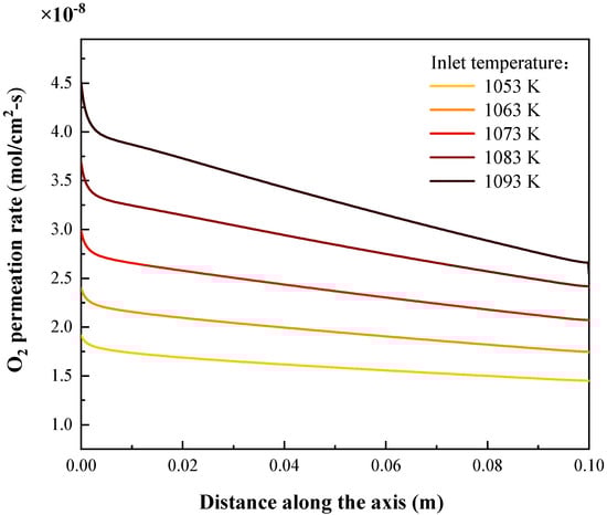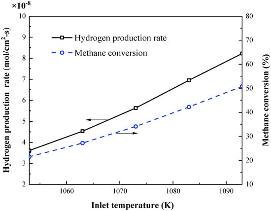 Figure 14 shows the distribution of the oxygen permeation rate along the axis at different inlet temperatures. It can be seen that, as the inlet temperature increases, the oxygen permeation rate gradually increases due to the decrease in the oxygen permeation resistance. Along the axis, due to the decrease in the membrane temperature, the oxygen permeation rate gradually decreases. Additionally, the higher the inlet temperature is, the larger the difference in the oxygen permeation rate between the inlet and the outlet of the reactor. Figure 15 shows the hydrogen production rate, as well as the methane conversion rate, at different inlet temperatures. Since the temperature directly affects the oxygen permeation process, increasing the inlet temperature can consume more oxygen permeated from the feed side and enhance the water splitting reaction, and thus effectively increasing the hydrogen production rate. When the inlet temperature increases from 1053 to 1093 K, the hydrogen production rate increases from 3.61 × 10−8 to 8.23 × 10−8 mol/cm2·s, a 1.28-fold increase. In addition, the methane conversion also increases with the increase in the inlet temperature. When the inlet temperature increases from 1053 to 1093 K, the methane conversion increases from 21.5% to 50.8%.