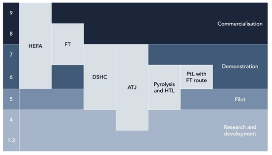 Secondly, the maturity level of a technology is based on the Technology Readiness Level (TRL). The TRL ranges from 1–9, in which TRL 1 is defined as the stage where basic principles have been observed and TRL 9 the stage where the technology has been proven in an operational environment [40,41]. An assessment of the TRL for HEFA, FT, Direct Sugars to Hydrocarbons (DSHC), Alcohol-to-Jet (ATJ), Pyrolysis, HTL was provided from [42] and for PTL from [43], which is depicted in Figure 1.