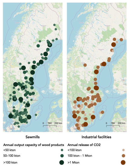 Locations and annual capacity of sawmills (sources of biomass) and industrial facilities (sources of CO2). Base map data © OpenStreetMap contributors, available under the Open Database License, terms further described in [106].