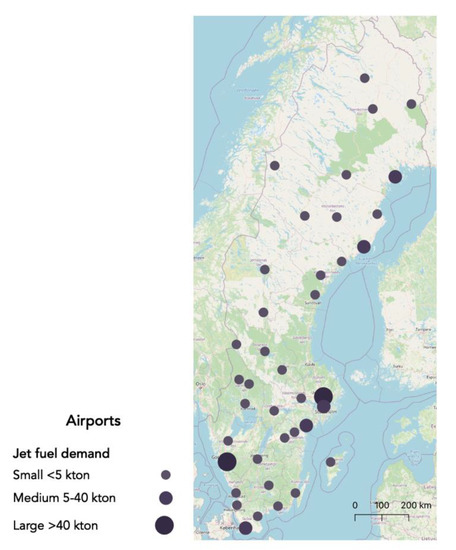 Airport locations in Sweden and annual jet fuel demand. Base map data © OpenStreetMap contributors, available under the Open Database License, terms further described in [106].