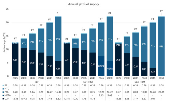 In the model, the production of FT, HTL and PTL are required to meet the jet fuel demand set by the blending mandate, while HEFA has been excluded since the feedstocks used for HEFA are either 1st generation feedstocks or are limited in supply. However, in the model, HEFA and CJF can be used to meet the remaining jet fuel demand that is not covered by the blending ratio, in which the choice is optimized based on their market prices and the internalized cost of emissions. For the RJF production, the GHG emissions during production and transport is included, which are based on the emission factors in Table 8.