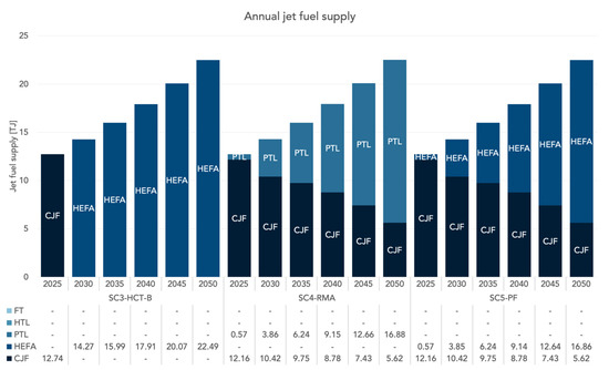 Thirdly, the selection of the conversion pathways considered the abundant and locally sourced feedstocks. In Sweden and the other Nordic countries, the interest of producing RJF have mainly been directed towards using forestry residue as feedstock [32]. The forestry industry is well-established in Sweden and utilizing the by-products for RJF production provides a great potential for conversion pathways such as FT and HTL. This makes it interesting to analyze the HTL pathway, although it has not been ASTM approved using forestry residues yet, the TRL level is promising with growing interest indicated by demonstration-scale activities [44]. Additionally, industries such as paper and pulp, chemical industries, etc., located in Sweden, have the potential to provide CO2 through carbon capturing, which could promote the production of PTL jet fuels by utilizing the CO2 released from industries. Since FT jet fuel has been approved by ASTM for a 50% blend, PTL jet fuel through the FT route is a conversion pathway with promising characteristics suitable as a drop-in jet fuel [45].