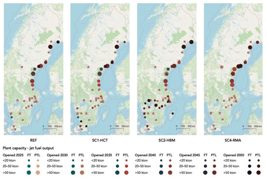 A Mixed Integer Linear Programming (MILP) optimization model was developed using Python 3.9 and the PuLP 2.4 library to solve the Facility Location Problem [142,143,144]. The spatial (supply chain components as presented in Figure 2) and temporal (multi-years assessment from 2020 to 2050) aspects are incorporated in the model. The objective of the MILP optimization model was to minimize the system cost of the supply chain, while determining an optimal location and production capacity of the jet-fuel plants. The model only considers the aviation sector in Sweden, considering the production of RJF from FT, HTL and PTL conversion pathways at the sawmills and industrial facilities, and the demand of jet fuel from and transportation of RJF to airports.