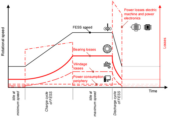 In any FESS, energy conversion and idle losses must be kept as low as possible, not only from an economic and efficiency point of view, but most importantly to avoid overheating of the system. To explain this circumstance in more detail: To reduce aerodynamic drag, the FESS rotor runs in an evacuated atmosphere, which in turn makes cooling difficult due to the absence of convection. However, windage losses are not the only losses occurring in an FESS as shown in Figure 1. Most losses depend on operating conditions, with rotational speed and ambient pressure being the most dominant ones [22].