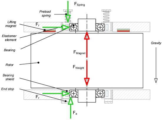 In this section, the basic design of the bearing system supporting the FESS rotor (CFRP rotor in Figure 2) is described. It consists of two angular contact spindle bearings in X-arrangement supporting a rotor that weighs 146 kg. To reach reasonable bearing service life, the rotor weight is compensated by a lifting magnet. By doing so, the bearings are axially loaded by only a fraction of the total rotor weight. Prerequisite for magnetic weight compensation is a vertical rotational axis of the rotor. The design of the magnetic weight compensation is discussed in more detail in Section 3.2.2. The mechanical bearing arrangement is axially preloaded by a spring setup that allows an accurate adjustment of the desired preload force. To allow small axial movement of the bearing (i.e., to compensate for thermal expansion effects), they are mounted in a bearing shield that is covered by an elastomer element on its outer circumference. The elastomer element further connects the bearing shields and the housing with low stiffness. This resilience is important for machine dynamics, because of the high operational speed reaching up to 30,000 rpm, as discussed in Section 3.1. For reasons of system simplicity and reduced cost, both bearings are grease lubricated and no oil supply periphery is considered. However, the methodological design approach presented in this publication is generally valid and may be applied to bearings with oil lubrication as well. For both lubrication concepts, the suitability of the lubricant at given operating temperatures and ambient pressure must be evaluated. This aspect will only be dealt with in Section 4.2 in this article, but more information about this topic can be found in [28,29]. A schematic diagram of the rotor-bearing-system is shown in Figure 3.