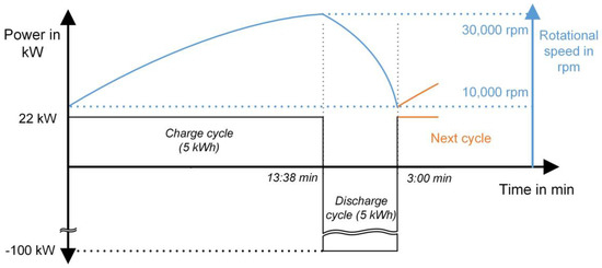 The load cycle of any FESS is of high relevance to the bearing system design and the one underlying the design of the FESS presented in this paper, is shown in Figure 4. The considered use case is integration in an EV fast charging station with the goal to provide high charging power even with only a standard 400 V/50 Hz three phase power connection (max. 22 kWel) at hand. Hence, the FESS is charged at a 22 kW rate within roughly 14 min and then discharged—as soon as an EV is connected to the charging station—at 100 kW power. In contrast to popular believe, studies have shown that most EV trips are rather short and hence a ~5 kWh energy transfer per EV charging cycle or trip is sufficient in >90% of the cases [5,26].