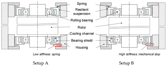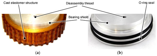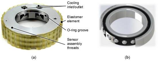 For supercritical operation the bearing system’s stiffness must be reduced to avoid resonance frequencies in the FESS’s nominal operating speed range. This is achieved by the use of resilient elements that connect the bearing shield with the housing. A low-cost solution, used often in turbomachinery applications, is suspension bearing seat implementing rubber O-ring seals to decouple the outer bearing journal from the housing. Stiffness and damping strongly depend on the fitting situation when O-rings are used. Another possibility is the implementation of cast elastomer structures. While solutions using O-ring seals may be less expensive, the use of cast elastomer structures increases flexibility during system design. Special geometry may be beneficial regarding axial stiffness or sliding, which is important for the realization of axial bearing preload. Furthermore, radial stiffness can be accurately modified by the variation of shape. Both solutions were investigated by the authors [33] and are illustrated in Figure 5a,b.