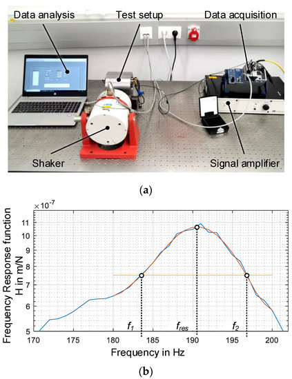 The test system is shown in Figure 7a, the result of a measurement shown in Figure 7b. To determine stiffness and damping the resonance frequency fres must be determined.