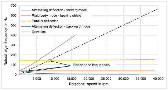Campbell plot of the rotor-bearing system with a resilient suspension stiffness of 5 N/µm Simulation conducted with MESYS Shaft (Version 07-2019, MESYS AG, Zürich, Switzerland).