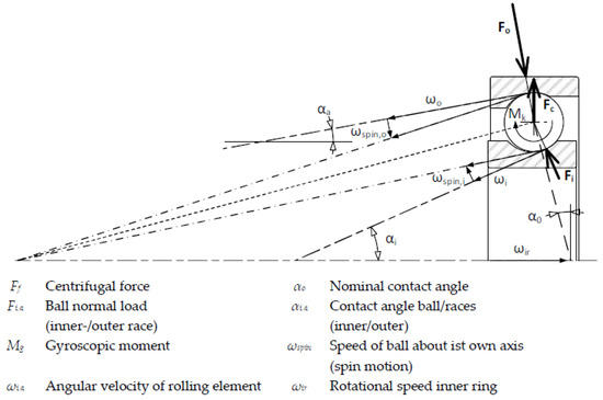 Bearing loads play a crucial role in system design for FESS regarding bearing kinematics as well as bearing life and torque loss. For that reason, bearing loads and optimization options that focus on the peripheral components will be analyzed in this section. Figure 10 shows the forces acting on a bearing ball of an angular contact spindle bearing. The ball normal forces Fo and Fi and the centrifugal force Fc on the rolling element must be in equilibrium. This results in different contact angles ai and ao between the rolling element and the inner/outer ring respectively during combined centrifugal and axial load, which is a decisive factor in bearing kinematics (see Section 3.2.3). Because of the contact angles in the bearings, even small axial loads lead to high ball normal forces, which determine bearing life (see Section 3.2.4). At the end of this section, these findings are applied to the FESS described in Section 2.4.