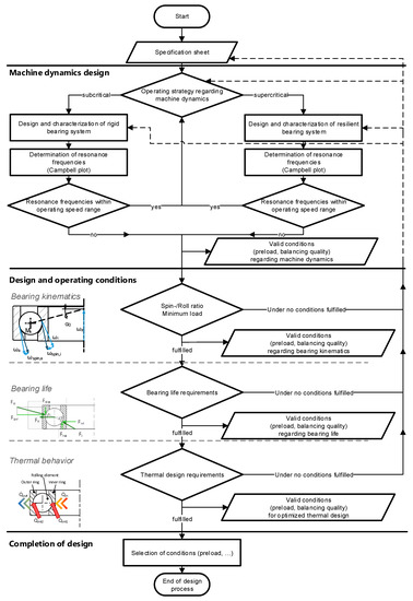 Furthermore, a detailed methodological guideline for FESS rolling element bearing design is published for the first time within this paper. Due to the highly demanding operating conditions present in FESS, special bearing system properties must be considered during the design process. This design process is summarized in Figure 25, giving a generally valid guideline for FESS incorporating roller bearings.