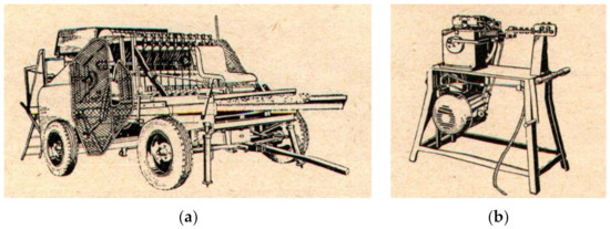Figure 2. Parts of the mobile technological line for manufacturing SOLOMIT in Czechoslovakia, consisting of: (a) a press for manufacturing SOLOMIT panels LS-140, and (b) AS-50 automatic staple-making machine [34].