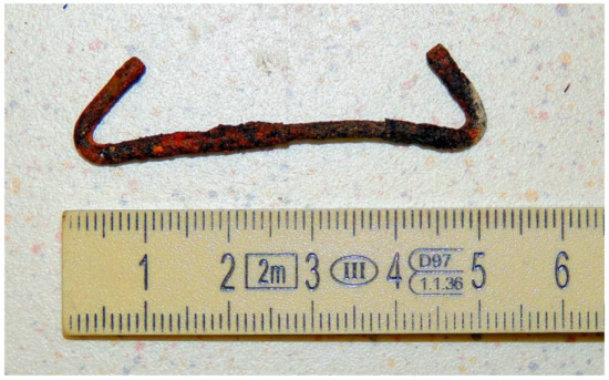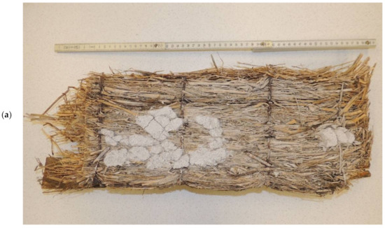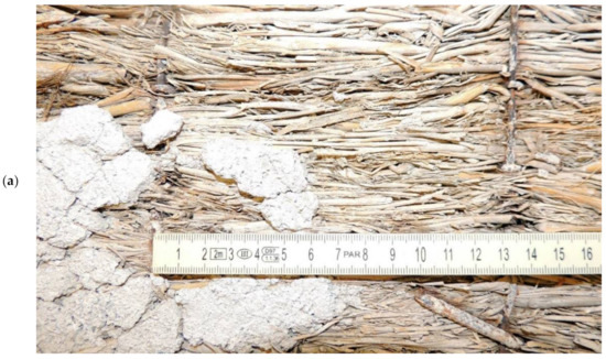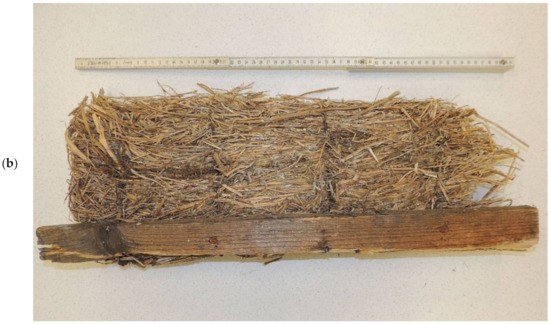 The finding condition of the sample (approximately 0.6 m long, 0.2 m wide and 0.05 m high) is documented in Figure 4. Rapeseed straw was the original material for producing the panel. The binding was made using steel staples and warp steel wires (Figure 4, Figure 5, Figure 6 and Figure 7). From the remnants of the wire, it can be concluded that the binding was realized with a wire stated in [33,34] (galvanized steel wire with a 2 mm diameter). The sample included the remains of a wooden structural frame and plaster. The edges of the sample were damaged in the disassembly. The part of the sample bounded by three warp wires and five staples on each warp wire could be considered coherent. The panel height (50 mm) and the spacing of the warp wires corresponded to the values reported in the literature [33].