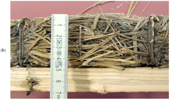 Figure 5. The tested SOLOMIT sample—cut rapeseed straw, binding with steel staples and the remains of the wooden structural frame and plaster: (a) surface of the panel, and (b) cross-section of the wall.