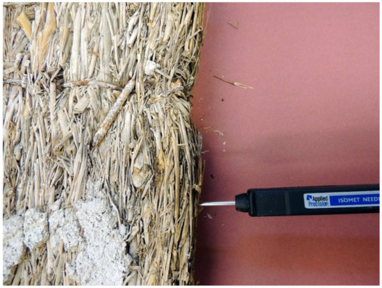 The measurement took place in the laboratory of CULS in Prague. The sample was stabilized to ambient temperature before each measurement. Prior to measurement, the mass moisture of the material was determined with the FH A696–MF and ALMEMO 2690-8 instrument sets (Ahlborn GmbH, Holzkirchen, Germany). Subsequently, the material temperature was determined by a needle sensor of the Isomet 2104 device (Figure 7). After the end of the temperature measuring cycle, the device was switched to the thermal conductivity measurement mode, and the cycle was started. In parallel with this measurement, the temperature and relative humidity of the air in the laboratory were determined with the FHA 646-21 and ALMEMO 2590-9 instrument sets (Ahlborn GmbH, Holzkirchen, Germany). The needle sensor was gradually inserted into various places in the sample following the device manufacturer’s methodology. Six measurements were carried out with the sensor inserted across the predominant direction of the compressed stalks, and five measurements were performed with the sensor inserted parallel to the predominant direction of the compressed stalks (this measurement corresponded to the direction of heat flow of the mounted panel). With the sensor inserted parallel to the direction of the stalks, an interval of 0.0511–0.0813 W·m−1·K−1 was determined for the specific thermal conductivity (95% probability considered). With the sensor inserted across the direction of the stalks, an interval of 0.0750–0.1028 W·m−1·K−1 was determined for the specific thermal conductivity (95% probability considered). A more detailed description of the experiment was provided in [45]. It should be noted that the experimental conditions did not comply with EN 12667 and that the result can only be considered indicative.