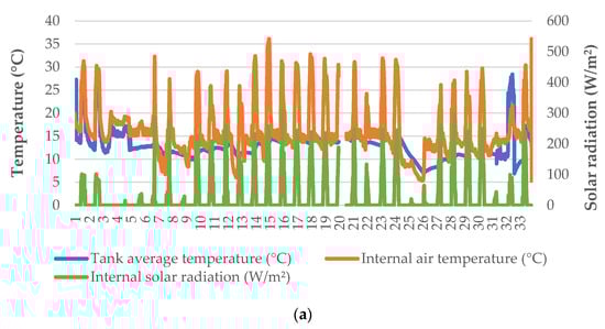 Heating was applied in the greenhouse to retain the minimum air temperature inside the greenhouse at ~14 °C, except for a limited number of nights during which there was a problem with the heat pump (Figure 1a). Even though external temperature was often near or below 0 °C during nighttime, the greenhouse conditions were favorable for leaf and root zone temperatures (Figure 1b). The solar radiation recorded inside the greenhouse was significantly lower compared to the incident radiation to the greenhouse, due to the diffuse glass cover (Figure 1c). However, it was possible to increase the air temperature inside the greenhouse up to 30 °C or more, since no ventilation was applied. Water temperature inside the trays was more uniform—especially after the first two days, following which there was a much lower range in the air temperature of the greenhouse.