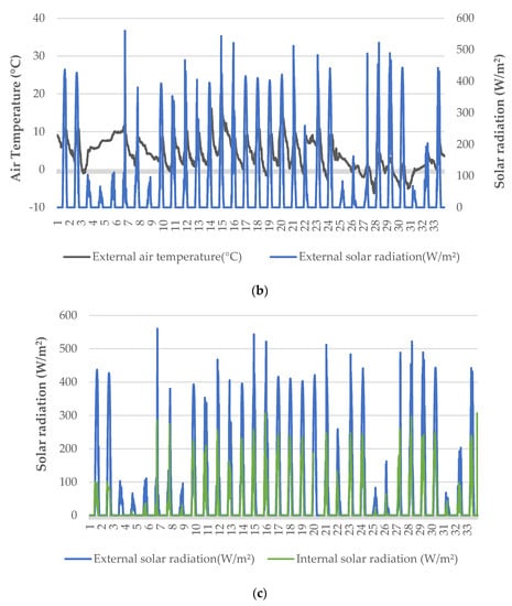 Microclimatic data (a), external weather conditions (b), and solar radiation (c) during the cultivation period.
