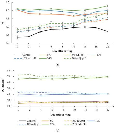The pH in the trays containing the Hoagland nutrient solution (control) was 6.35 and 6.71 at the beginning and the end of the experiment, respectively, while its value ranged from 6.35 to 6.99 during the cultivation (Figure 2a). In the trays with 5% digestate, the pH was 8.03 at the beginning of the cultivation period, and it dropped to 7.8 by the end of the cultivation, while during the cultivation the pH value ranged from 7.65 to 8.03 (Figure 2a). In the trays with 5% digestate in which the pH had been adjusted, the value at the beginning of the cultivation was 6.69, and at the end it was equal to 7.45, while during the experiment the range of pH values fluctuated between 6.69 and 7.45. In the trays with 10% digestate, pH was 8.07 at the beginning of the crop and 8.00 at the end; during the cultivation, pH values ranged from 7.68 to 8.07 (Figure 2a). In the trays with 10% digestate in which pH was adjusted, at the beginning of the experiment its value was 6.69, while at the end it was 7.57; during the cultivation period, the pH ranged from 6.69 to 7.57. In the trays containing 20% digestate, the pH at the beginning of the experiment was 8.11, while at the end it was 8.29, with a range during the cultivation from 7.99 to 8.29. In the trays with 20% digestate and adjusted pH, the pH was 6.81 at the beginning of the experiment and reached 7.88 by the end, while its values during the cultivation ranged from 6.81 to 7.88.