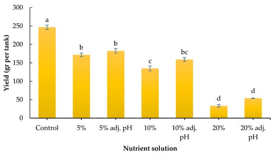 Yield was significantly affected by the nutrient source. Specifically, the control led to the highest obtained yield compared to all liquid digestate treatments, while the latter followed a negative gradient from 5 to 20% liquid digestate. In particular, 5% with or without pH adjustment showed significantly greater yield compared to the non-adjusted 10% and both 20% treatments, while both 10% treatments showed greater yield compared to both 20% treatments (Figure 3). Our results are consistent with those of a previous study by Celletti et al. [], who found greater shoot and root fresh weight in maize seedlings produced with a nutrient solution compared to liquid cow manure digestate. It should be noted that the digestate used in the experiment was obtained after the obligatory pasteurization process of the biogas plant. Therefore, potential microbial impacts on root development and plant stimulation were not considered in this study.