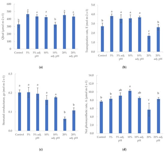 Photosynthetic parameters (Qleaf: photosynthetic active radiation (a), Ε: transpiration rate (b), gs: stomatal conductance (c), and A: net photosynthetic rate (d)) of baby lettuce cultivated under different digestate solutions. Columns (means ± SE) with different letters are significantly different (p < 0.05).