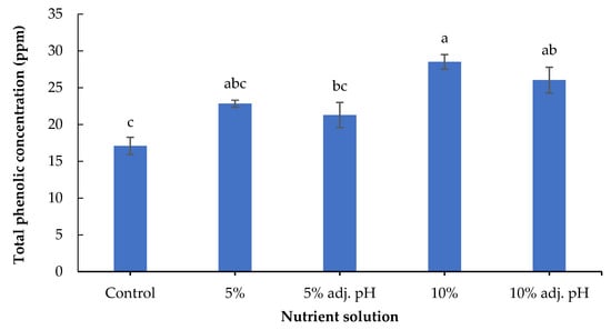 Total phenolics of baby lettuce leaves grown in a floating hydroponic system under different dilutions in water during the winter period. Columns (means ± SE) with different letters are significantly different (p < 0.05).