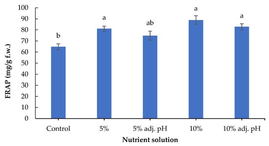 Secondary metabolites including phenolic compounds are produced in response to stress factors, and are involved in plant defense and signaling []. The lowest concentration of total phenolics was found in the control treatment, and was significantly lower compared to the treatments in which 10% digestate was added (with and without pH adjustment). Furthermore, 10% liquid digestate also showed significantly greater values compared to 5% with adjusted pH (Figure 6). A previous study also demonstrated the beneficial effects of manure-based fertilizers on the phenolic compounds of fruit and vegetable plants compared to conventional farming systems []. Leafy vegetables such as lettuce contain several antioxidant compounds that are essential both for a healthy human diet and for the control of oxidative stress in plants []. The antioxidant potential displayed by FRAP was significantly enhanced in non-adjusted 5% and both 10% liquid digestate treatments compared to the control (Figure 7). These results are consistent with those of a previous study reporting that the application of liquid digestate in 10, 20, or 30% concentrations enhanced the total phenolic content and DPPH scavenging activity of cucumber compared to the treatment that was grown in non-fertilized soil []. These results showcase the positive effects of organic fertilization on the production and accumulation of antioxidant compounds in crops.