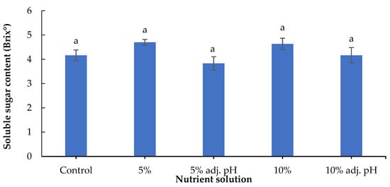 A method to evaluate and quantify the taste of leafy vegetables is the determination of soluble sugar content. In a study with tomatoes, the authors reported greater fruit Brix in plants treated with digestate derived from food waste compared with a synthetic fertilizer or no fertilizer []. Another study with tomatoes revealed greater Brix content in organically produced fruits compared to conventional systems, while bell peppers in the same study did not show significant Brix differences []. In our case, no significant differences were observed in soluble sugar content among the nutrient sources (Figure 8). It must be noted that lettuce grown with 20% wastewater treatment, either with or without pH adjustment, did not produce sufficient yield for phytochemical determinations.
