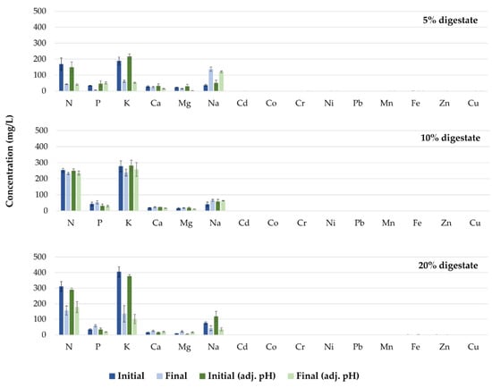 The reductions in nutrient concentrations in the growth media with the above results demonstrate adequate mineral uptake by the plants (Figure 9). Specifically, the concentrations of all elements in the growth media (except for Na in the treatments in which 5% digestate was added) decreased throughout the cultivation period. Conversely, the increase in Na concentration in the treatment that included 5% digestate could be attributed to low uptake by the plant, and subsequent accumulation in the root zone. It has previously been reported that Na interferes with other elements, such as Ca and Mg, which often leads to plant disorders []. Further studies are required in order to study the interaction between mineral concentrations in the growth media and their accumulation in plant tissues.